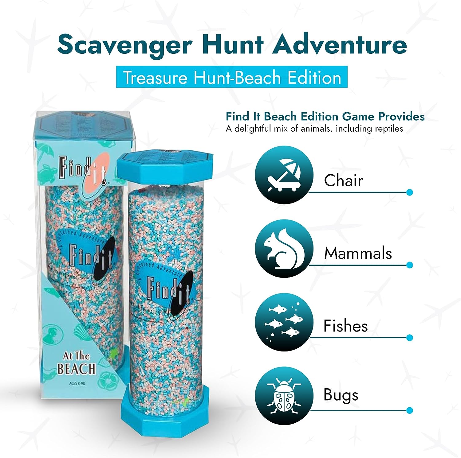 Take a trip to the shore with Find It At the Beach, the captivating seek-and-find game filled with seaside fun! Inside this clear cylinder are ocean-colored pellets hiding over 40 beach-themed treasures, including sea creatures, beach finds, a sneaky US penny, and more. Aqua end caps add a calm coastal touch, while the included checklist lets players track what they've found. Perfect for summer days, vacations, or relaxing playtime, this game enhances focus, visual recognition, and fine motor skills for both kids and adults. It’s more than just fun—this game also boosts focus, fine motor skills, and visual recognition, making it a delightful and educational addition to any playtime.