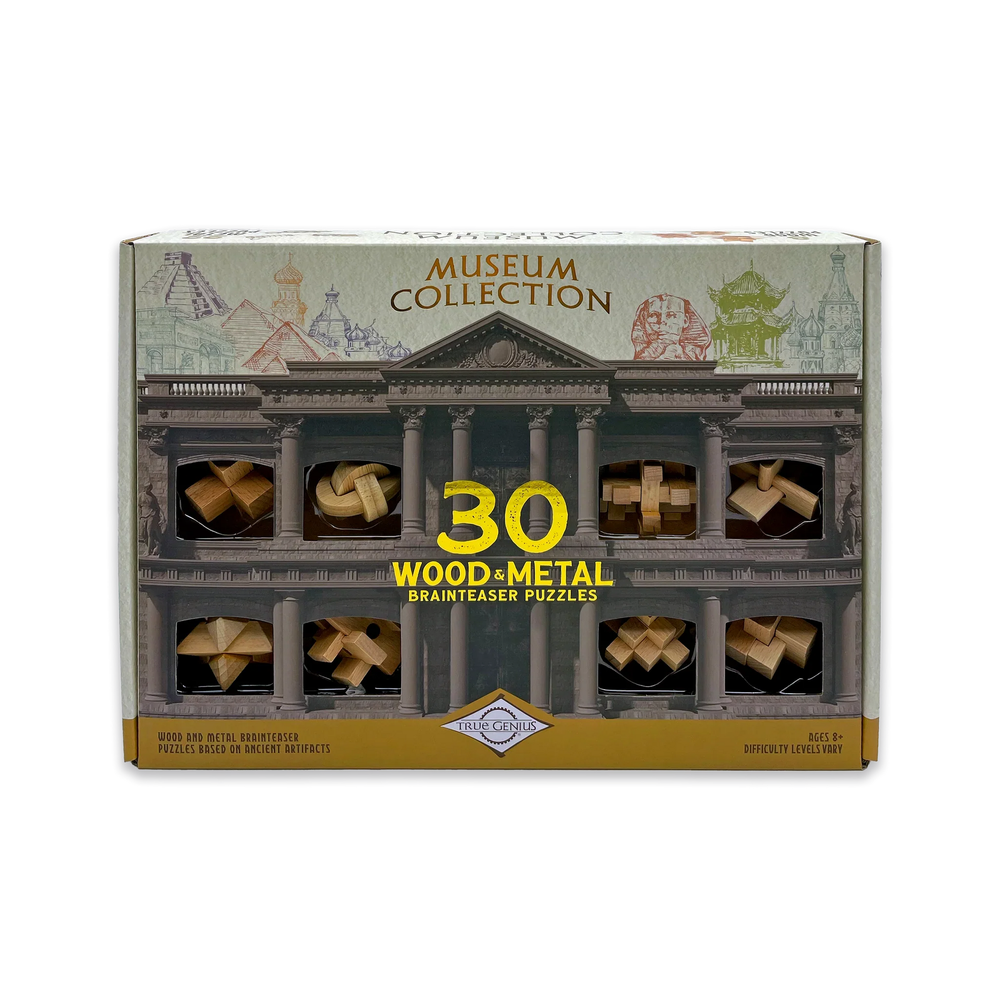 The True Genius Museum Collection (30-Piece Gift Set) is an impressive assortment of 30 brainteasers that bring ancient ingenuity to life. This set includes 22 metal disentanglement puzzles and 8 wooden disassembly puzzles, each designed to challenge problem-solving skills and enhance spatial reasoning. With puzzles of varying difficulty, it provides an engaging experience for all ages (8+). The collection is elegantly packaged, with gold lettering and a museum-style display, making it a perfect gift for puzzle enthusiasts and history buffs. Ideal for family fun or solo play, this set is both an educational and visually appealing addition to any collection
